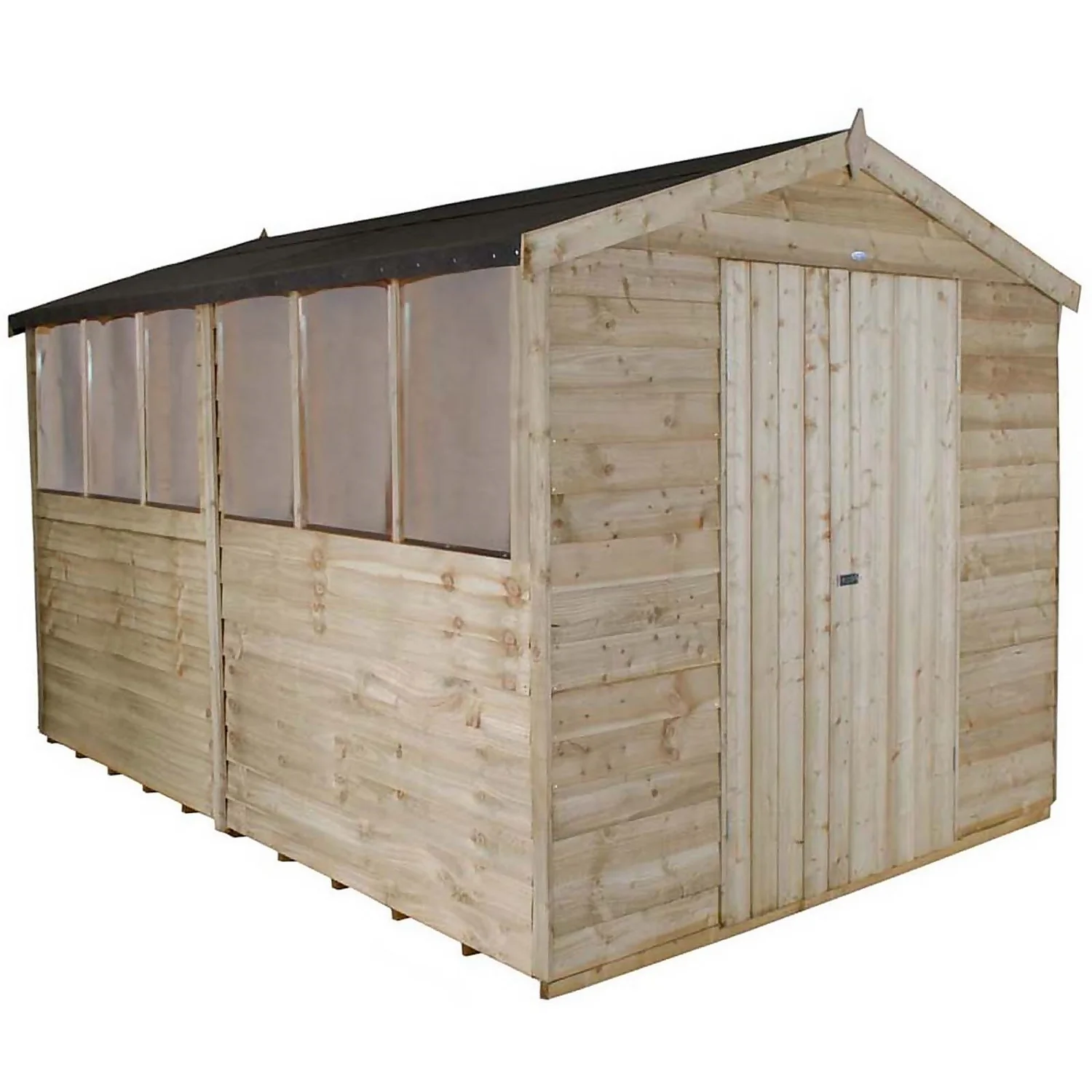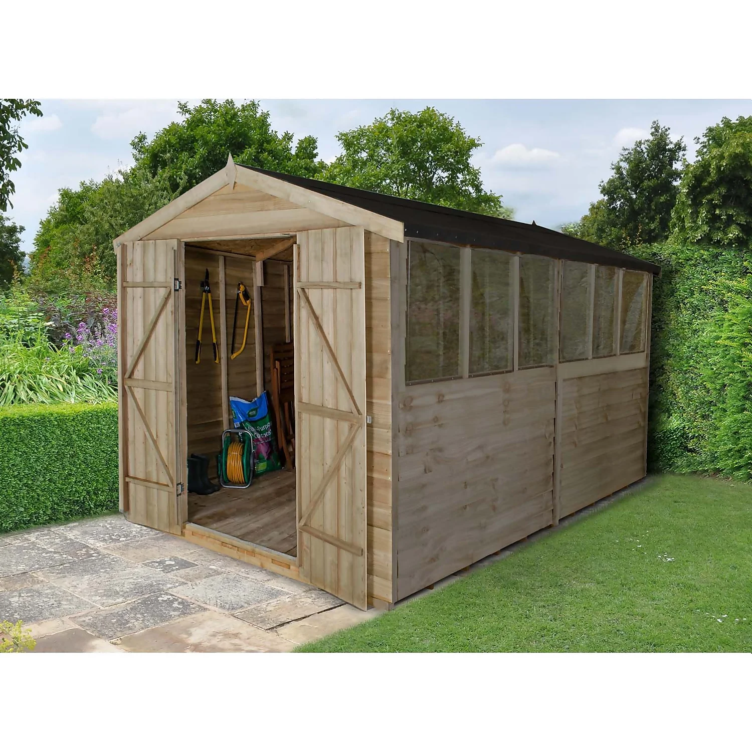 The Overlap Pressure Treated 12×8 Apex Workshop from Forest has a practical and traditional design and is built to last. It will help keep your garden clutter free and offers a secure space for you to store garden equipment. Its fantastic size, double doors and 6 fixed windows make it an ideal workshop space where light can flood in. The Pressure Treated solid timber boarded floor allows for the storage of heavier items such as lawnmowers or bags of compost.
