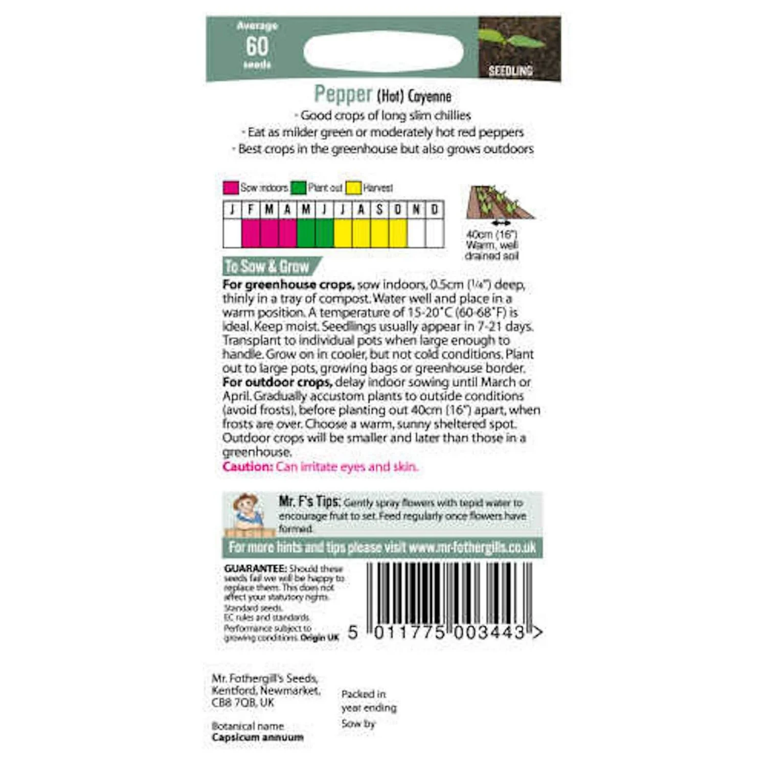 Hot Pepper Cayenne (Capsicum annuus) produces excellent yields of long slim bright red chillies. Best grown in a greenhouse.