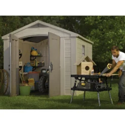 This attractive 8x7ft apex roof steel shed is perfect for tidying away items such as garden tools, lawnmowers and outdoor toys.